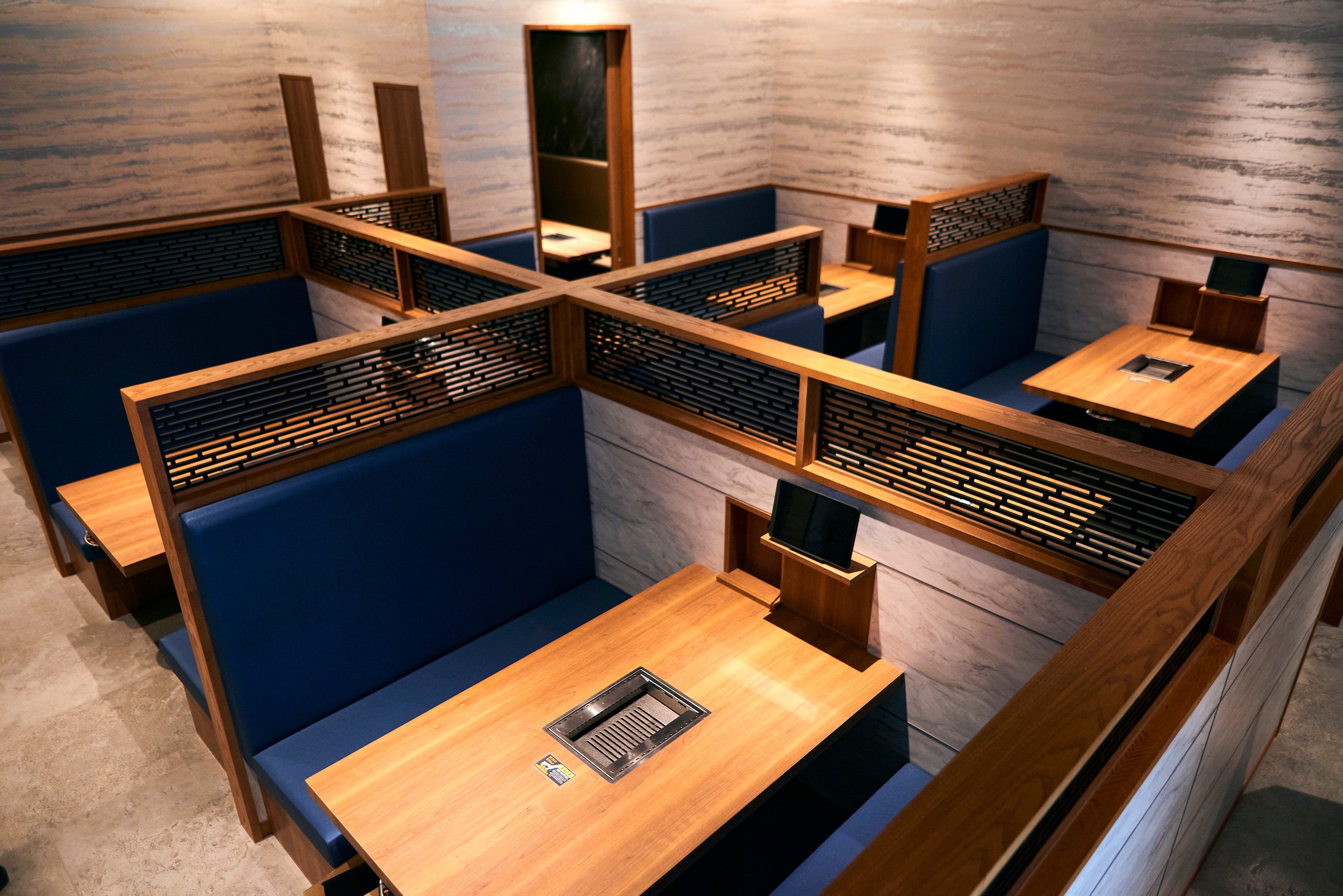 焼肉無煙ロースターで焼肉の煙と一緒に店内の空気を店外に排気することで、約3分半で客席全体の空気を入れ替えています。