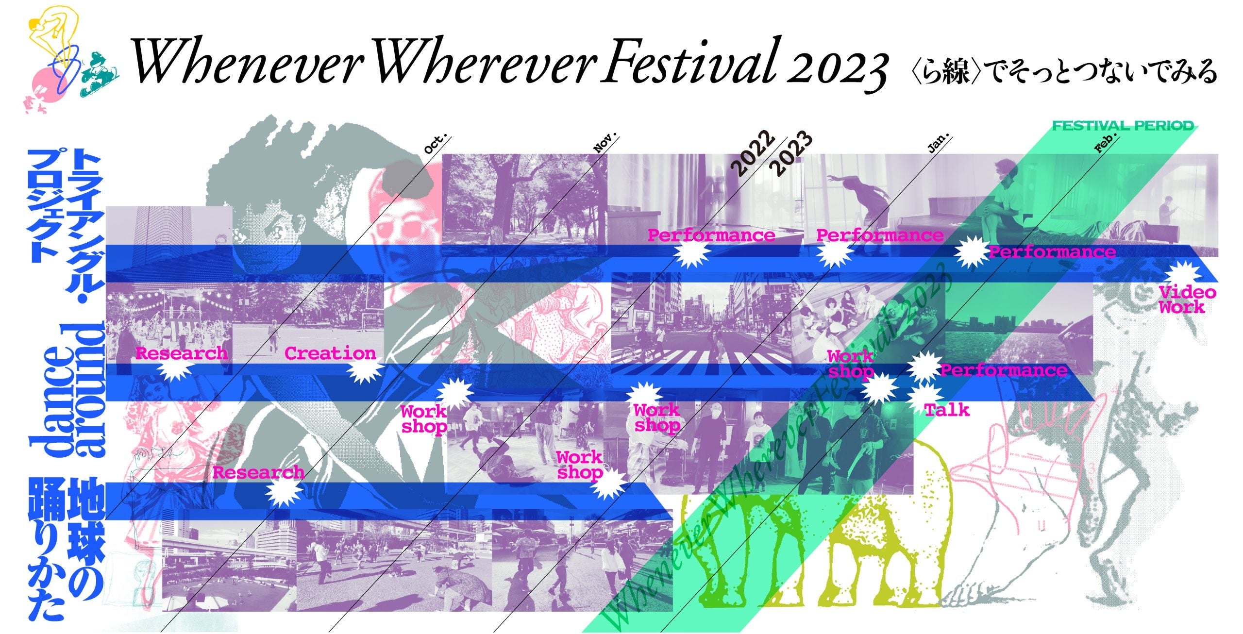 WWFes2023では、場所を複数の身体が横断するとき創発され形づくられる環境を、〈アラウンドネス〉と捉えてみたいと思います(何かの周辺を指す〈◯◯らへん〉と呼ばれる広がりを思い浮かべてみてください)。そこには、固有の体験や知覚を伴って醸成される、地図とは異なる空間が浮かび上がってくるはずです。ダンスやパフォーマンスと生活空間が隣りあう、さまざまな〈アラウンドネス〉を透かし見ながら発見すること。そして、緩やかに関連しあう複数のプロジェクトを、時空を超えた〈ら線〉でそっとつないでみる試みがWWFes2023です。- ピックアップ・プログラム