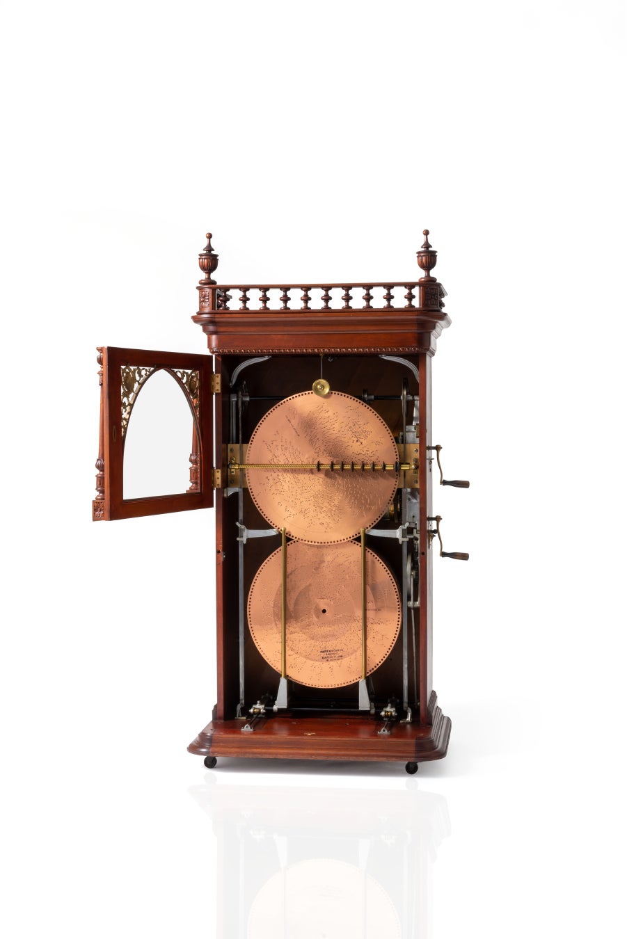 ● 作品概要:オルゴールの原型とも言われる、ドイツ製のカリヨン付き時計。カリヨンとは音階のあるベルのことで、大型のものは教会の鐘に用いられ、街中に時を告げた。木製円柱(シリンダー)にピンを打ち込むことで複雑な音階を記録している。