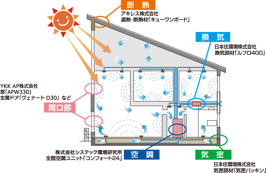 今回受賞した「中小工務店向け支援型高性能全館空調システム(製品名:エクセレント ハウジング システム)」は、“高断熱、高気密+全館空調”を基調とし、住環境とエネルギーの専門技術者を持たない地域ビルダーでも、専業メーカー4社が支援することでこれを実現できるスキームとなっています。全館空調システムを設計するシステックが中心となり、断熱・遮熱性能支援を行うアキレス、開口部性能支援を行うYKK AP、換気計画・気密性能支援を行う日本住環境の4社がタッグを組み、建築計画に基づく「システム提案⇒設計⇒施工⇒検証」のプロセスを各社が適宜サポート。快適な住宅の供給と、シミュレーションや実証データによる継続受注のサポート、遠隔計測によるアフターフォローを確実に行えるようにし、全館空調の導入経験のない工務店でも安心して導入できるように営業支援を全国各地で展開します。