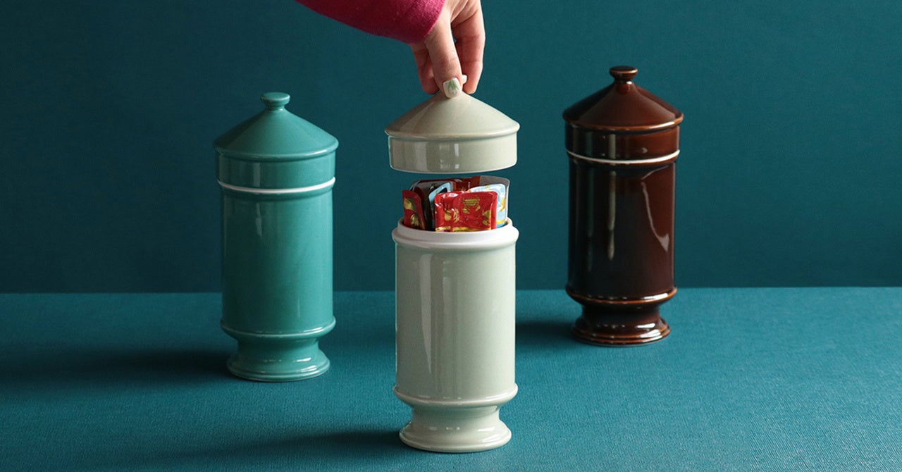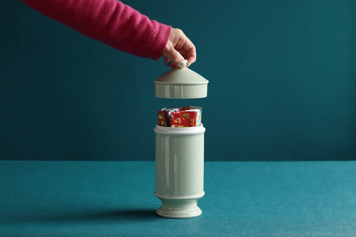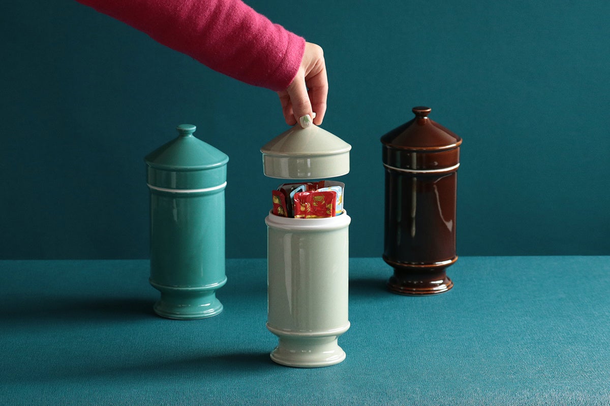 HASAMIスナックキャニスターは、猫のおやつの収納にぴったりの既製品がなく苦労していたマルヒロ社員の経験から誕生したアイテム。海外のガラスのキャンディジャーのような磁器製のキャニスターで、脚付きのスリムなボディは場所も取らず美しい見た目です。