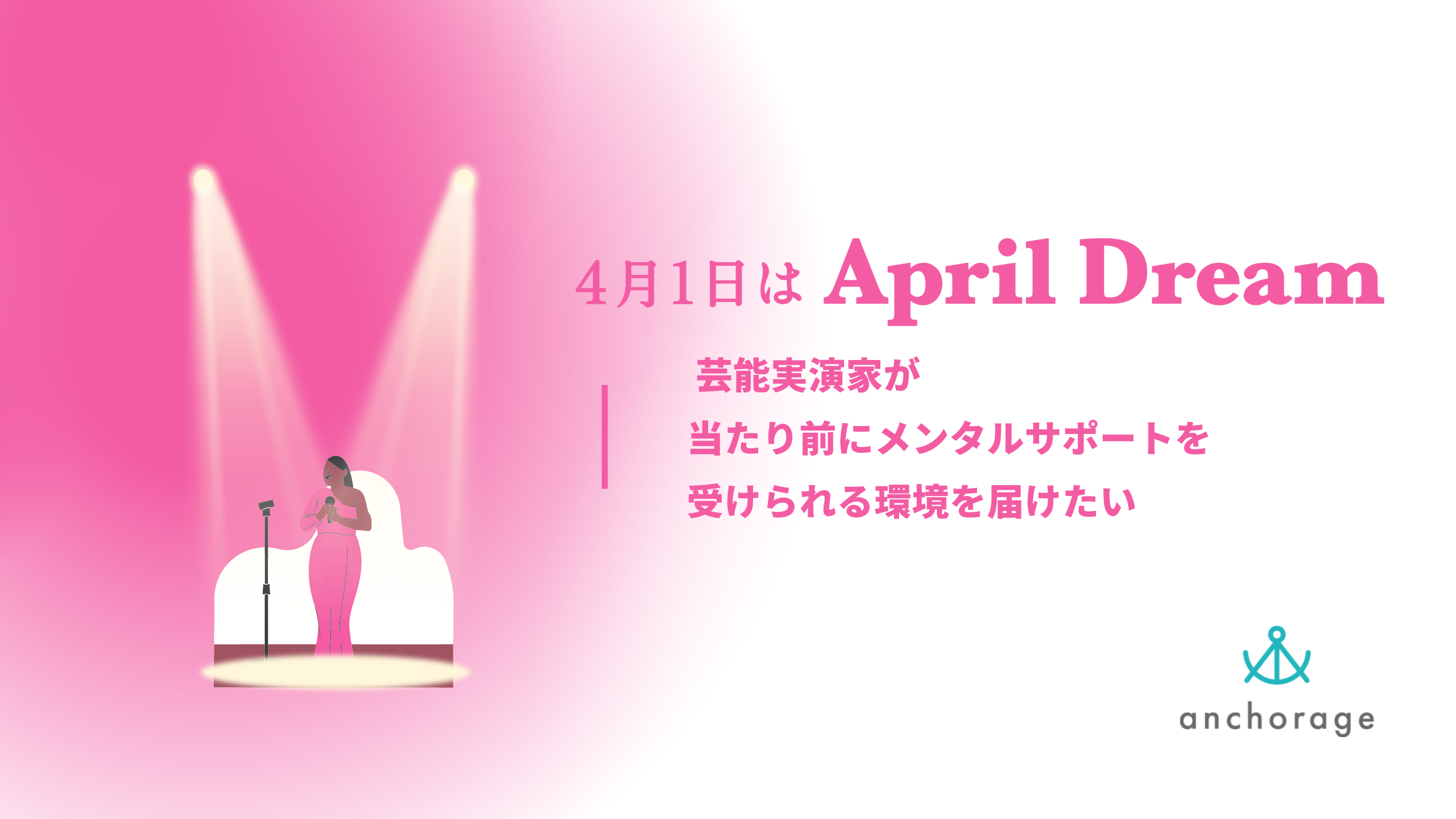 当社は、4月1日を夢を発信する日にしようとするApril Dreamに賛同しています。このプレスリリースは「合同会社anchorage」の夢です。芸能プロダクションやアクティングスタジオと提携をしてタレントや俳優のサポートを行う合同会社anchorageは、芸能実演家や周囲のスタッフが安心してメンタルサポートを受け、健康的に活動を継続できる環境を届けます。