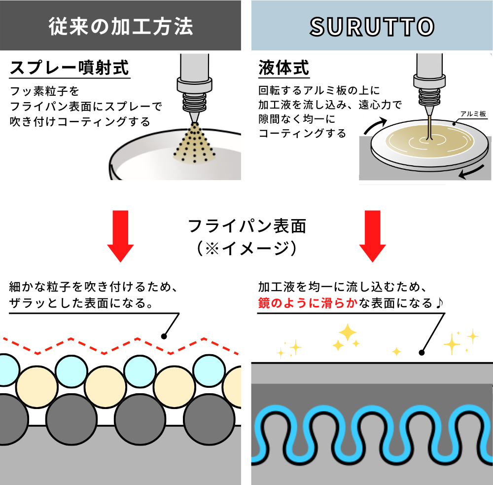 従来のフッ素コーティングは、スプレー式のため、粒子と粒子の隙間から食材の油等が侵しやすく、それが劣化を早める原因となっていました。対して、SURUTTOのコーティングは、回転式というフッ素の加工液を流し込むコーティング方法で、隙間を無くし、劣化を防ぎ、高い耐久性を実現しました。(㈱生活品質科学研究所にて、JIS S 2010に準じて試験実施)