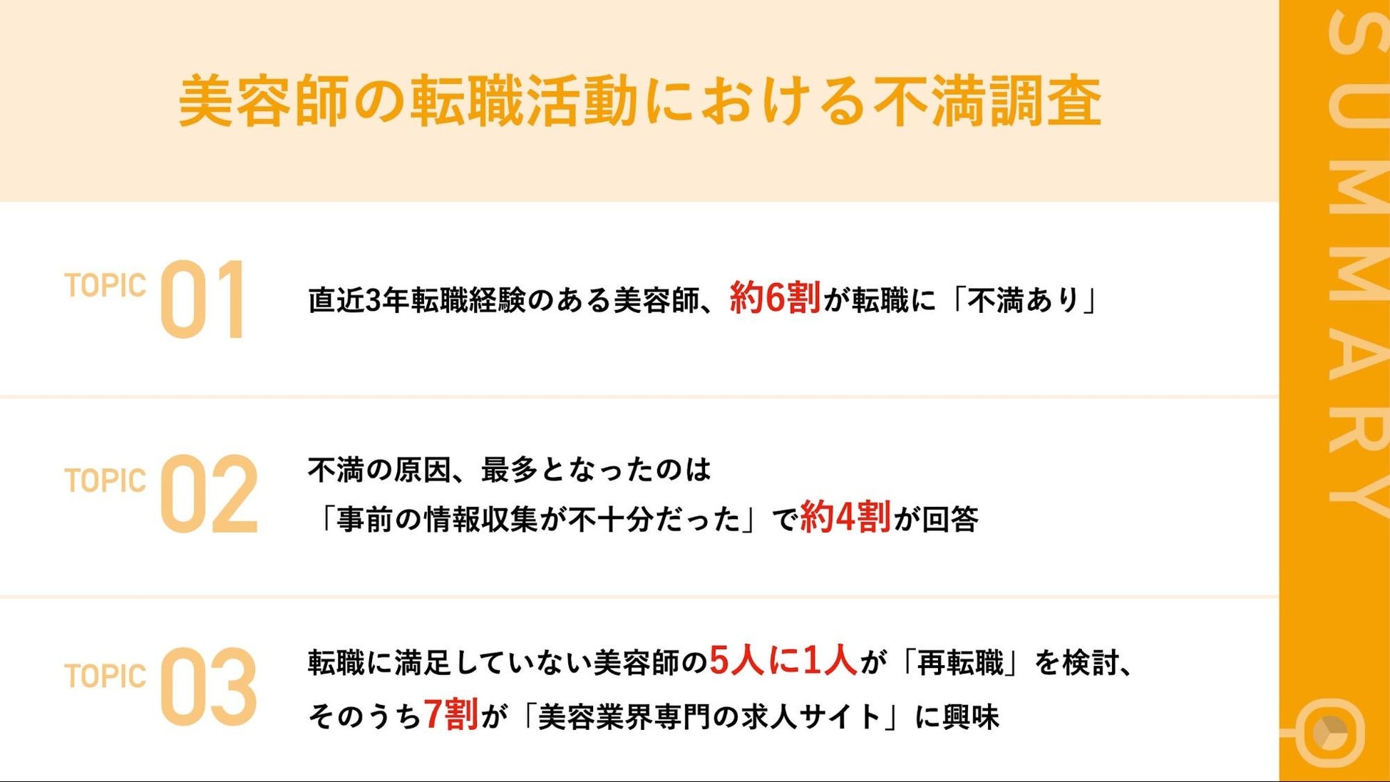 今回の調査では、転職したものの、現在の職場に不満を抱えている美容師が多く、事前にもっと情報を収集しておけば良かったと後悔しているケースが少なくないことが分かりました。5人に1人が再度転職を検討しており、従来の職場探しでは転職を繰り返さざるを得ない状況となっています。美容業界専門のスタッフが無料で転職をサポートしてくれる美容業界専門の求人サイトに関して、転職を検討中の7割から関心が寄せられており、美容師に特化したサービスを利用することが、美容師と職場とのマッチングの精度を上げる鍵となるのではないでしょうか。