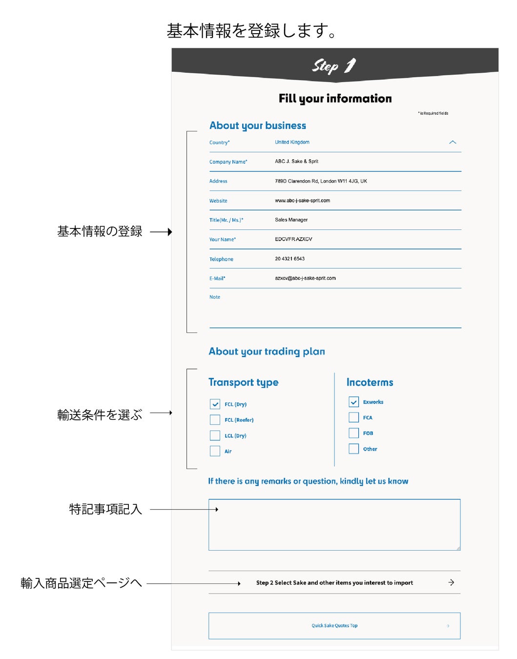 まずSTEP1では、バイヤーの基本的な情報(所属国、会社名、住所、電話番号、会社websiteなど)を入力して頂きます。バイヤーの基本情報の入力が終了したら、利用したい輸送方法(船便or航空便など)、インコタームズ(EXW, FCA, FOB or その他)、特筆事項などを選択して、次の見積もり検索・依頼のステップに進みます。