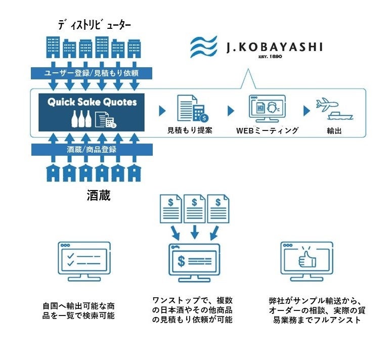 株式会社小林順蔵商店(本社:大阪市西区、代表取締役社長:小林佑太朗)は、業界初(※)の日本酒海外輸出WEB自動見積もりシステム「Quick SAKE Quote」(https://j-kobayashi.com/qsq/)を2023年2月にリリース致しました。「Quick SAKE Quote」を活用することで、日本酒の輸入を検討しているバイヤーはWEB上で輸入可能な商品を一覧で検索し、商品を選ぶだけで迅速に見積もりを取得することが出来ます。
