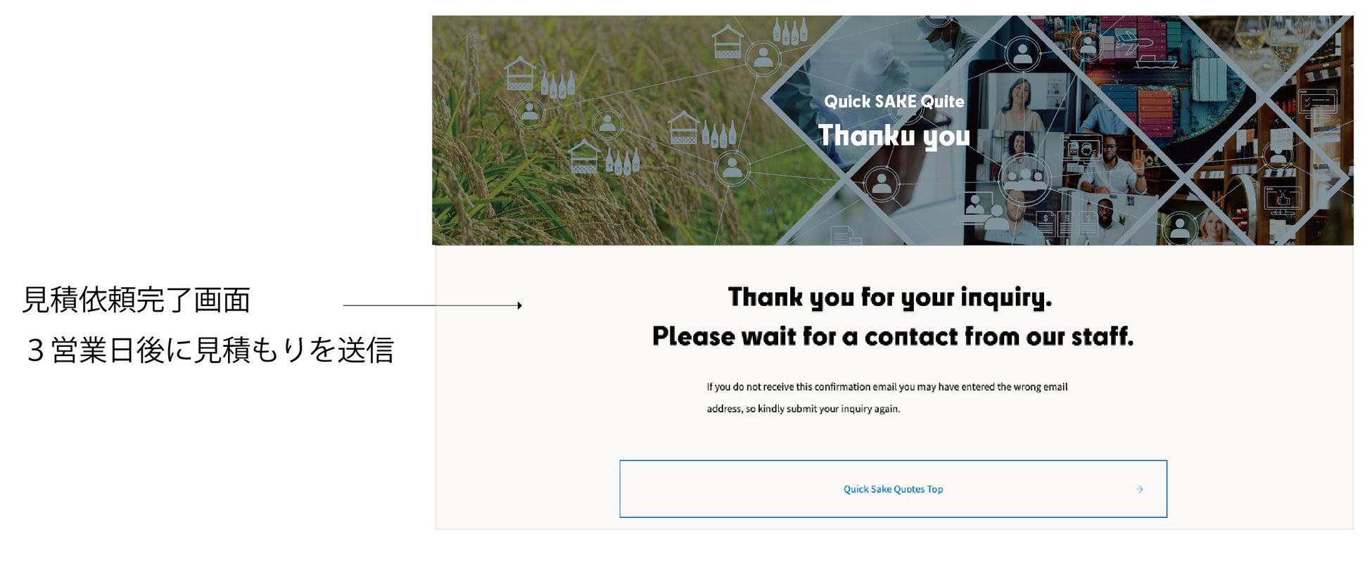 「Quick SAKE Quote」(以下、本サービス)は、世界中のバイヤーがWEB上で輸入可能な商品を瞬時に検索でき、わずか3STEPで見積もりを取得できるのが特長です。お問い合わせからお見積り提案までの期間を出来る限り短くすることで、直感的でスピーディーな検討を可能にし、成約率の最大化を目指します。