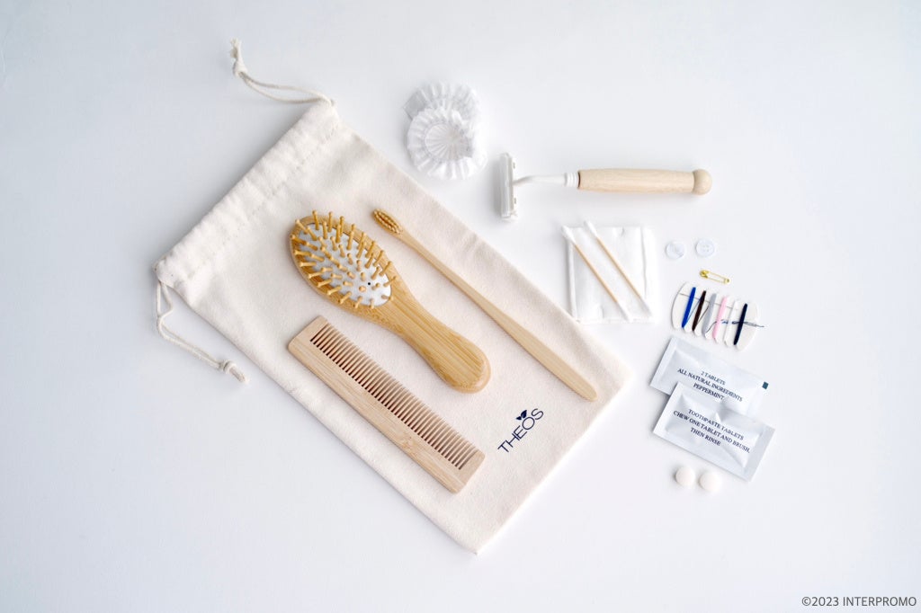 竹歯ブラシ・歯磨き粉タブレット・竹カミソリ・竹コーム・竹ヘアブラシ・PLAシャワーキャップ・女性用コットンセット・ソーイングセット・お持ち帰り用コットンバッグ・ほか※詳細はお問い合わせください