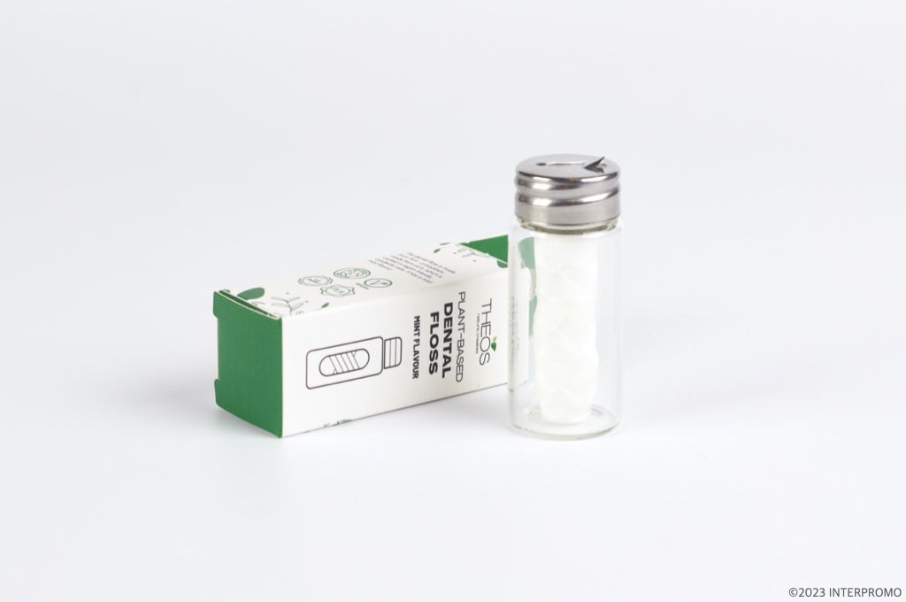 コーンスターチ由来のPLA(生分解性プラスチック)を使用した、ミント味のお口と地球にやさしいデンタルフロスです。素材:フロス)PLA 100% / 瓶)ガラス・アルミ
