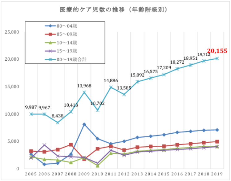 2005年〜2018年で医療的ケア児は2倍の2万人