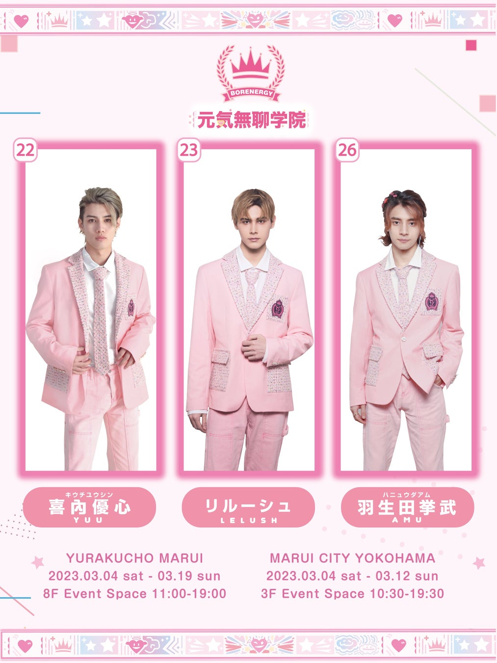 中国エンターテイメントの日本展開を行う株式会社ドロップは、中国を中心に人気を博す男性タレントのリルーシュ、羽生田挙武、喜内優心の3人による公式ポップアップイベント『元気無聊学院(げんきぶりょうがくいん 以下、本イベント)』を、マルイ店舗(有楽町マルイ/マルイシティ横浜)でスタートします。開催期間は有楽町マルイが3月4日(土)から3月19日(日)まで、マルイシティ横浜は3月4日(土)から3月12日(日)までとなります。
