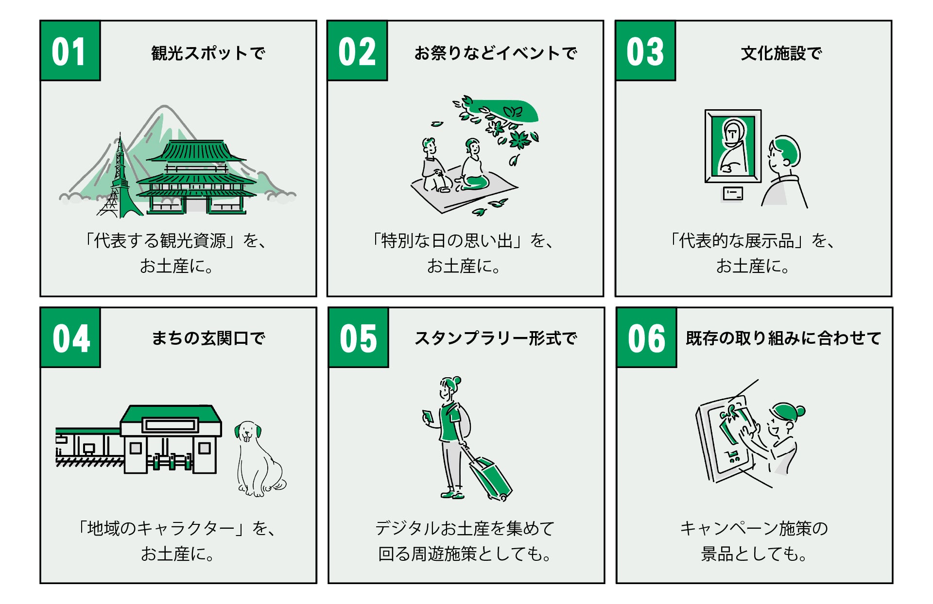 サービスの導入シーンや場所、デジタルお土産のデザイン、所有者限定の特典は、まちの特性に合わせて企画・実装致します。観光スポットでの常設配布や、イベントでの期間限定配布、特産品やまちのキャラクターをモチーフにしたデジタルお土産など、導入に関する詳細はご要望に合わせてご提案させていただきます。また、すでに行われているSNS施策や各種キャンペーンと連動して導入いただくことも可能です。
