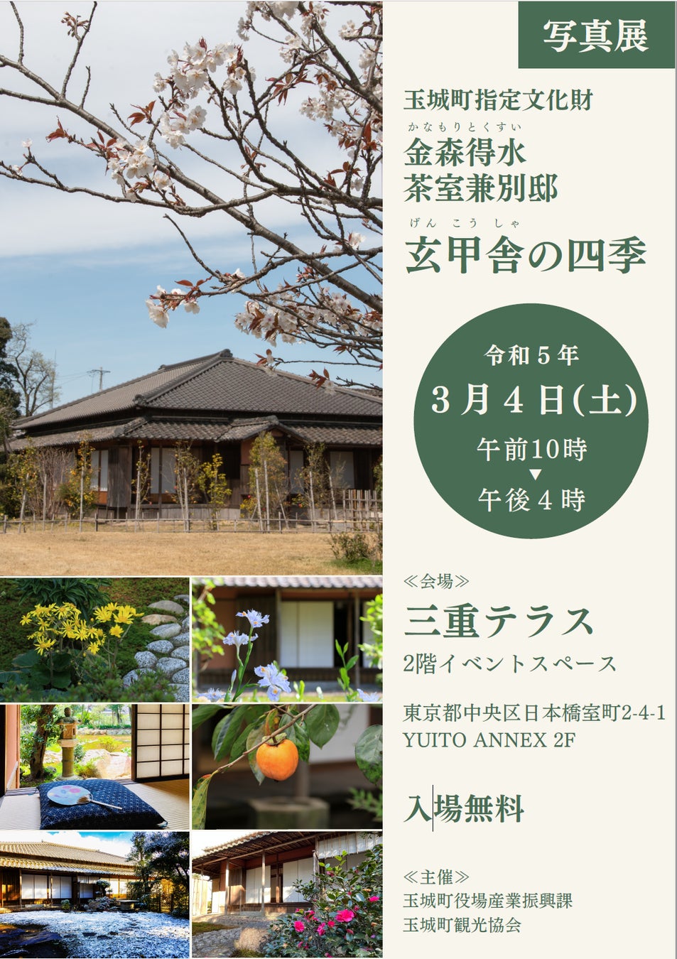 三重県玉城町(たまきちょう)にある町指定文化財「玄甲舎(げんこうしゃ)」の写真展を、東京日本橋の「三重テラス」にて3月4日(土)に開催。玄甲舎は、玉城町のシンボルである田丸城跡の家老をつとめた人物・金森得水(かなもりとくすい)が設計・建築した茶室兼別邸。建物内や庭園など、季節によりさまざまな景色を楽しめる玄甲舎の写真を展示します。