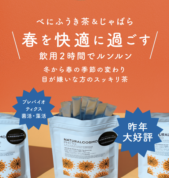 「AFAブルーグリーンアルジー」は、約30億年前に地球で初めて光合成を始めたシアノバクテリアの一種で、アミノ酸20種類やオメガ3系脂肪酸、鉄分、ミネラル、ビタミンB12などの栄養素が含まれ、ヴィーガンやベジタリアンの方々に特に人気の食品で、広くアメリカ、ヨーロッパなどで食されています。このアイテムは、菌活食品とべにふうき茶、ジャバラを混ぜ、春を快適に過ごすスッキリ茶として、人気を博しています。
