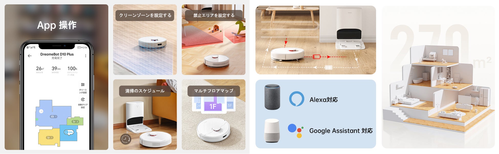 タイマー機能やスマートスピーカー※への対応はもちろんのこと、ゴミ収集タイミング、回数、吸引力の設定に加え、進入禁止エリアや仮想の壁を設定することも可能です。