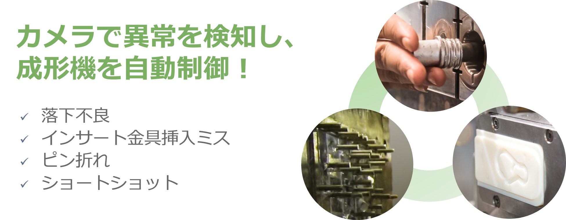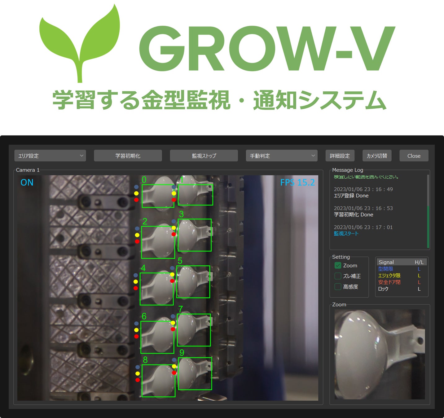 GROW-Vは、プラスチック成形中の異常を検知し成形機を制御するカメラシステムです。「落下不良」や「ピン折れ」、「インサート金具挿入ミス」「ショートショット」等、あらゆる異常から大切な金型と製品を守ります。
