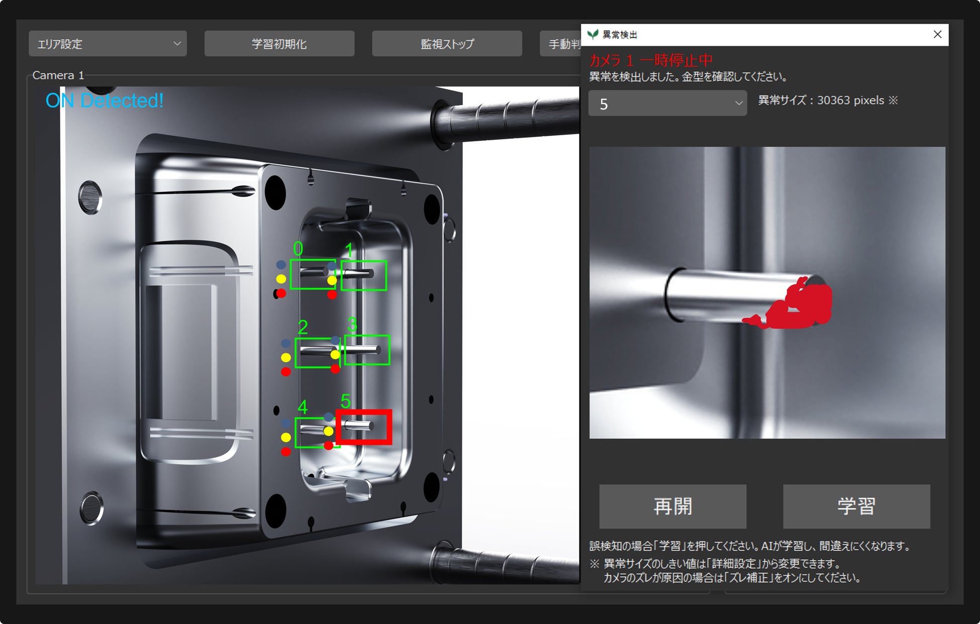 この対策として、金型をカメラで監視するシステムを導入する企業も少なくありません。しかし、些細な照明変化やカメラのズレなどを検知してしまい都度生産が止まってしまうこと、また条件設定が煩雑な為、見逃しを防ぐまでに試行錯誤を要することが課題となっていました。