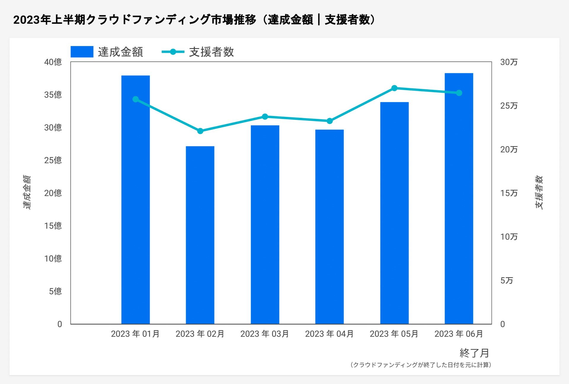 2023年上半期、毎月約2,000件のクラウドファンディングが新しく開始され、2023年6月は全クラウドファンディング(※)の達成金額合計が38億円を突破しました。クラウドファンディングは資金調達だけでなく、プロダクトや飲食物のテストマーケティング、新商品のプロモーションなどにも利用され、新しいプロジェクトやアイデア実現の手段となっています。