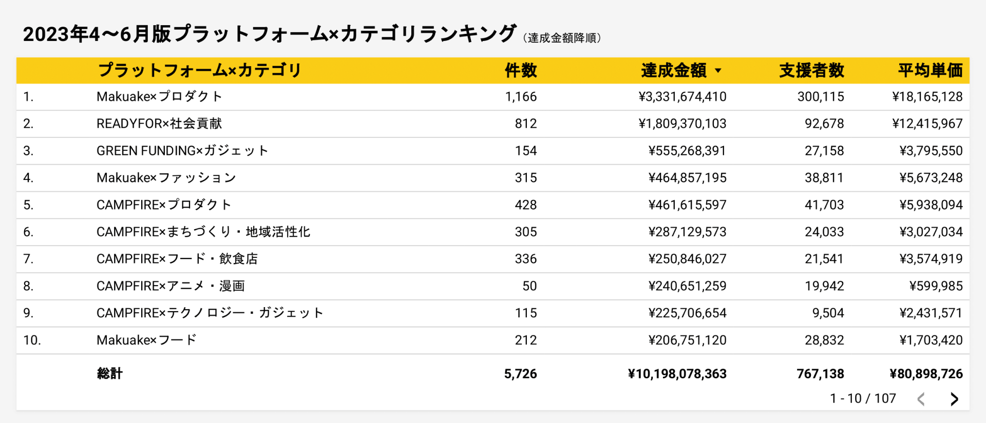 CAMPFIREは実施件数では最大のプラットフォームですが、達成金額、支援者数ともに1位はMakuakeとなり、プラットフォームによる特性が現れる結果となりました。