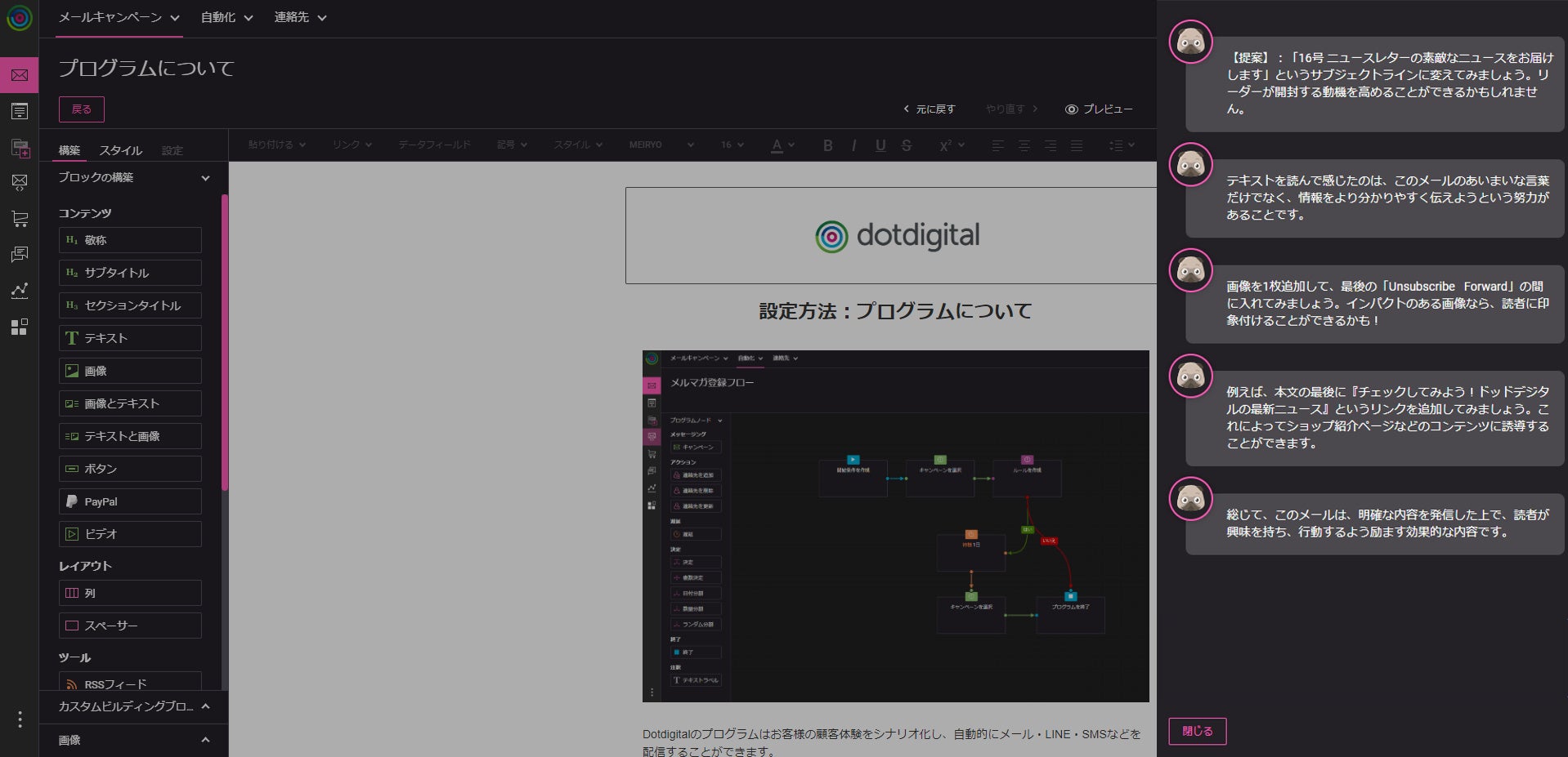 レビュー依頼のメールは通常のメールと同じように作成。Dotdigitalのドラッグ&ドロップのメール編集画面よりカスタマイズし、購入後から7日・14日・30日後に配信するように設定できます。