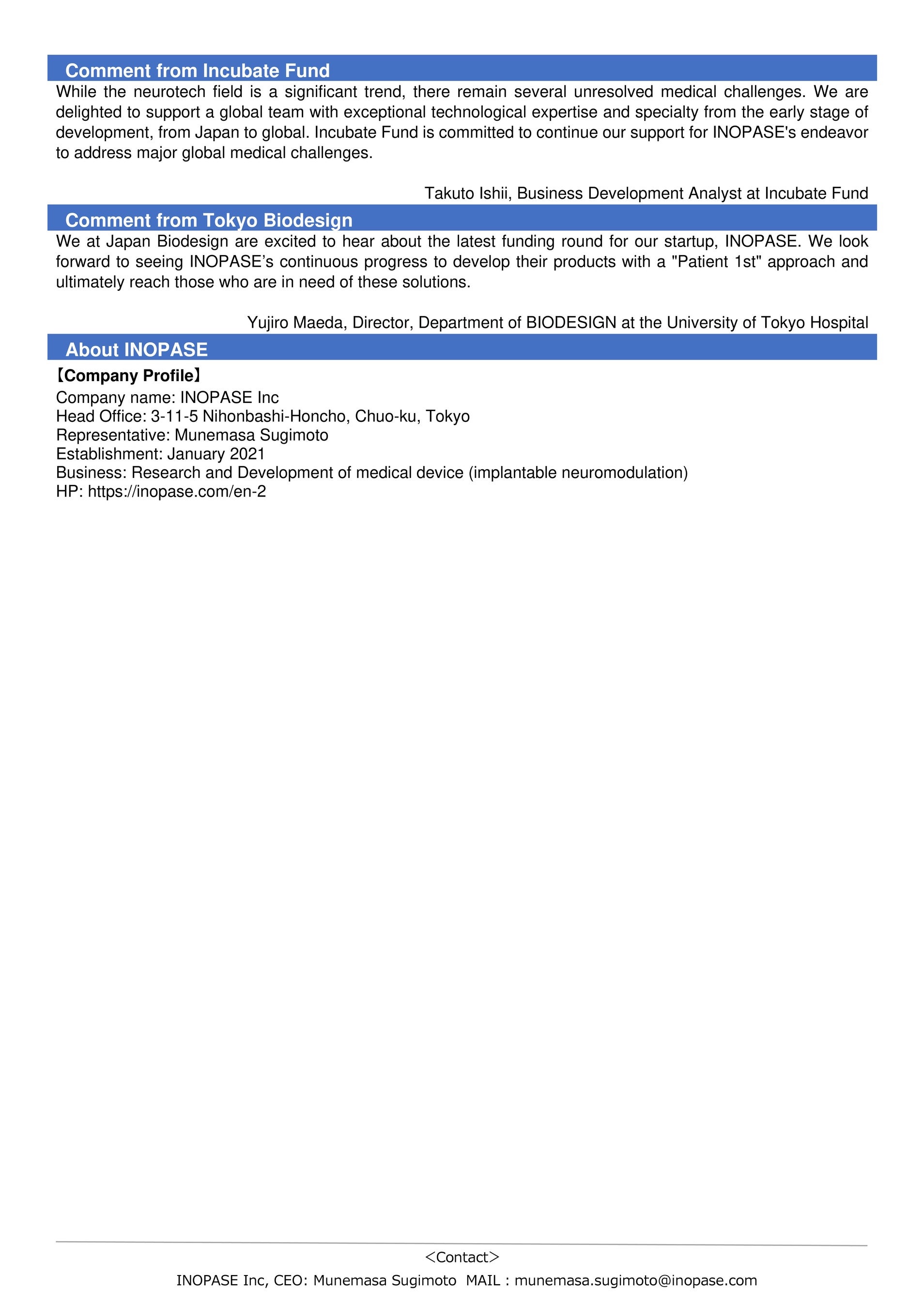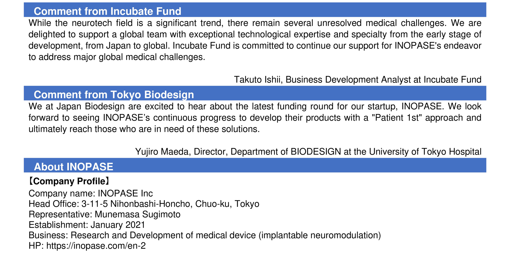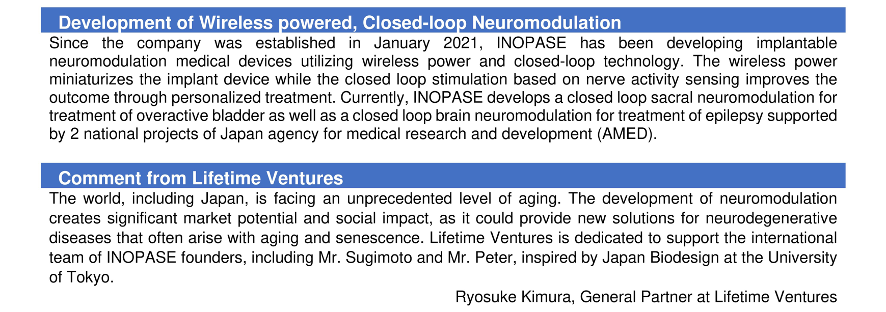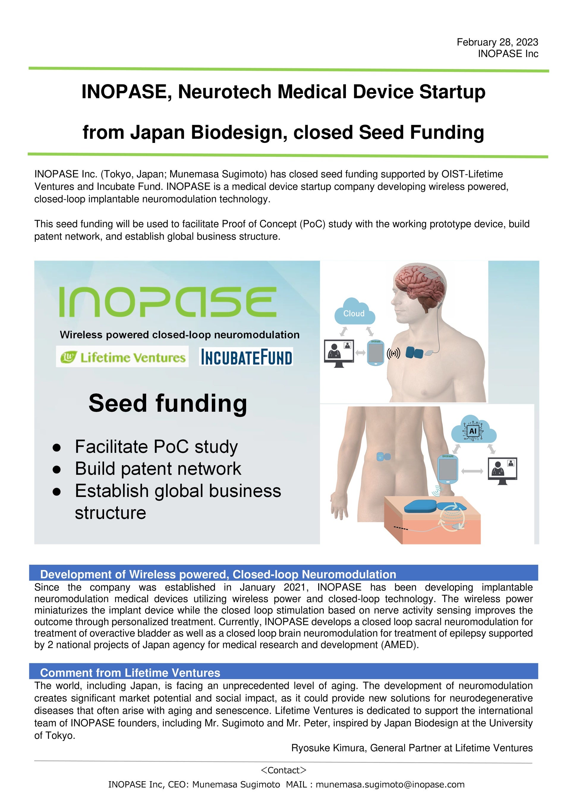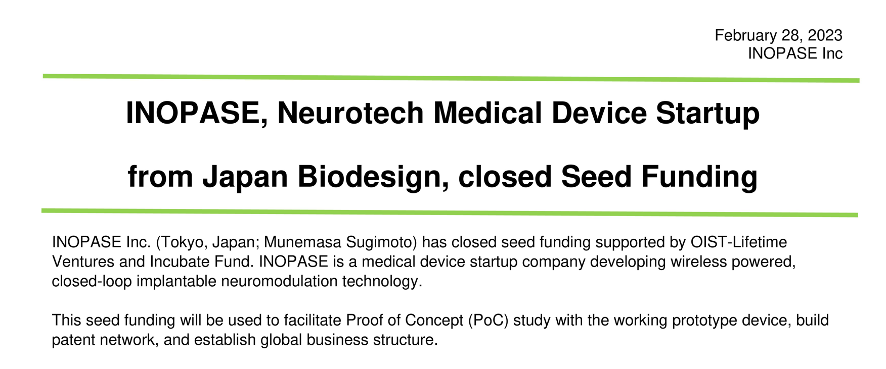 植込み型ニューロモジュレーションの開発に取り組む医療機器ベンチャー・株式会社INOPASE(本社:東京都中央区、代表:杉本 宗優、以下INOPASE)は、この度、ライフタイムベンチャーズが運営するOIST-Lifetime Ventures Fundおよびインキュベイトファンドを引受先とする募集新株予約権の発行を実施し、シード資金調達を行ったことをお知らせします。