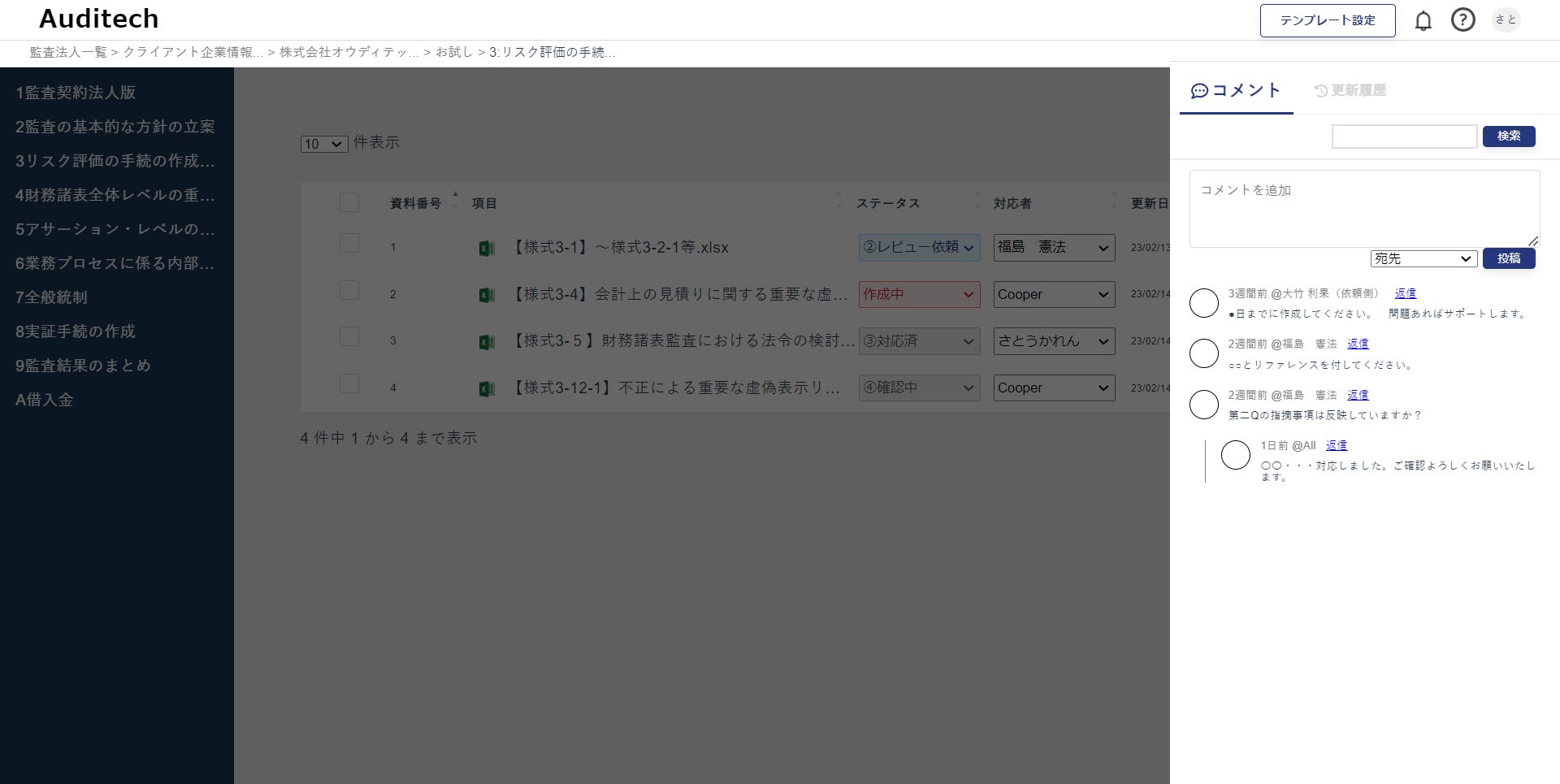 調書は複数の査閲(チェック)を通して品質が担保されます。査閲時のフィードバックは別のツールを活用することも多い状況かと思います。しかし、調書作成のツールとコメントのツールが分散していると効率性を害してしまうことがあります。そこで、両者を一体化することで効率性と品質の同時達成をできるよう工夫をしました。助言や指導されたコメントを参考に、例えば「次回の監査ではここを注意しよう」「TCFDの開示についてもっと知りたい」など若手とベテランのコミュニケーションが活発化し、事務所としての品質向上にも寄与できるものと考えております。