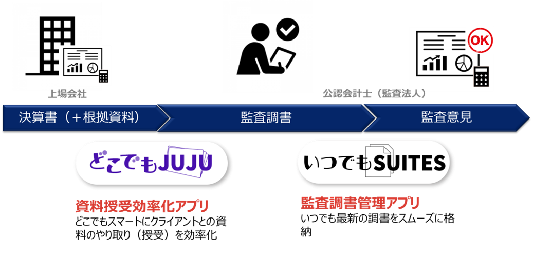 「いつでもSUITES」では調書更新の記録はもちろん、監査業務を効率化するファイル共有アプリ「どこでもJUJU」と連携することにより被監査会社(クライアント)と資料をやり取りしたファイルと監査調書をクラウドで連携して管理できます。