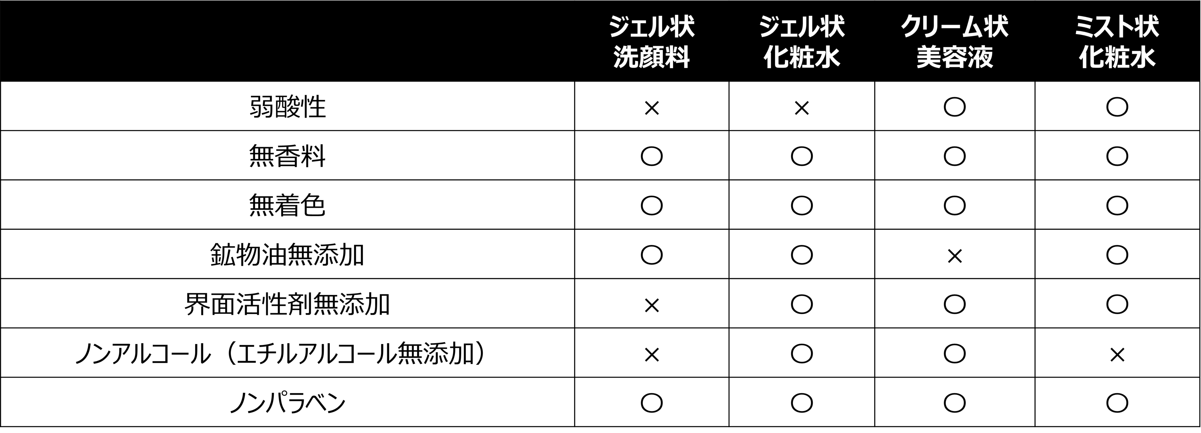 弱酸性、無香料、無着色、界面活性剤無添加、ノンアルコール(エチルアルコール無添加)、ノンパラベン