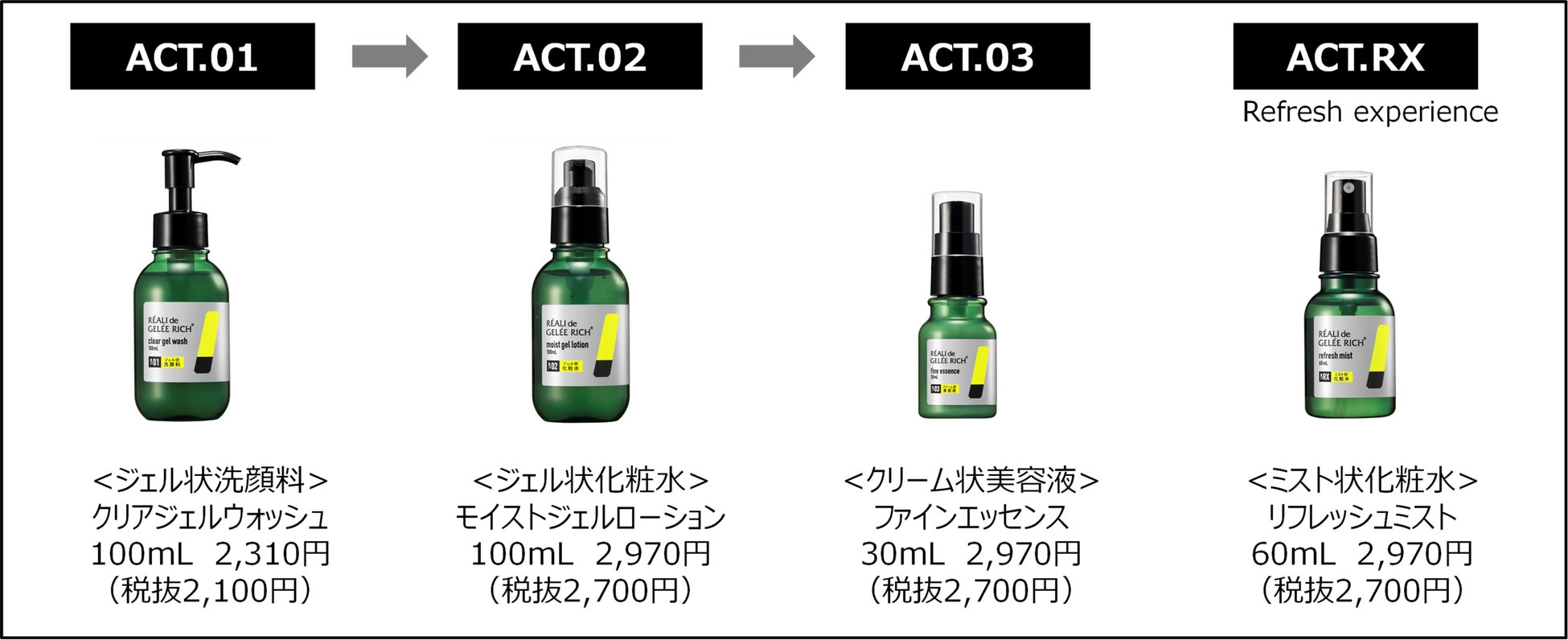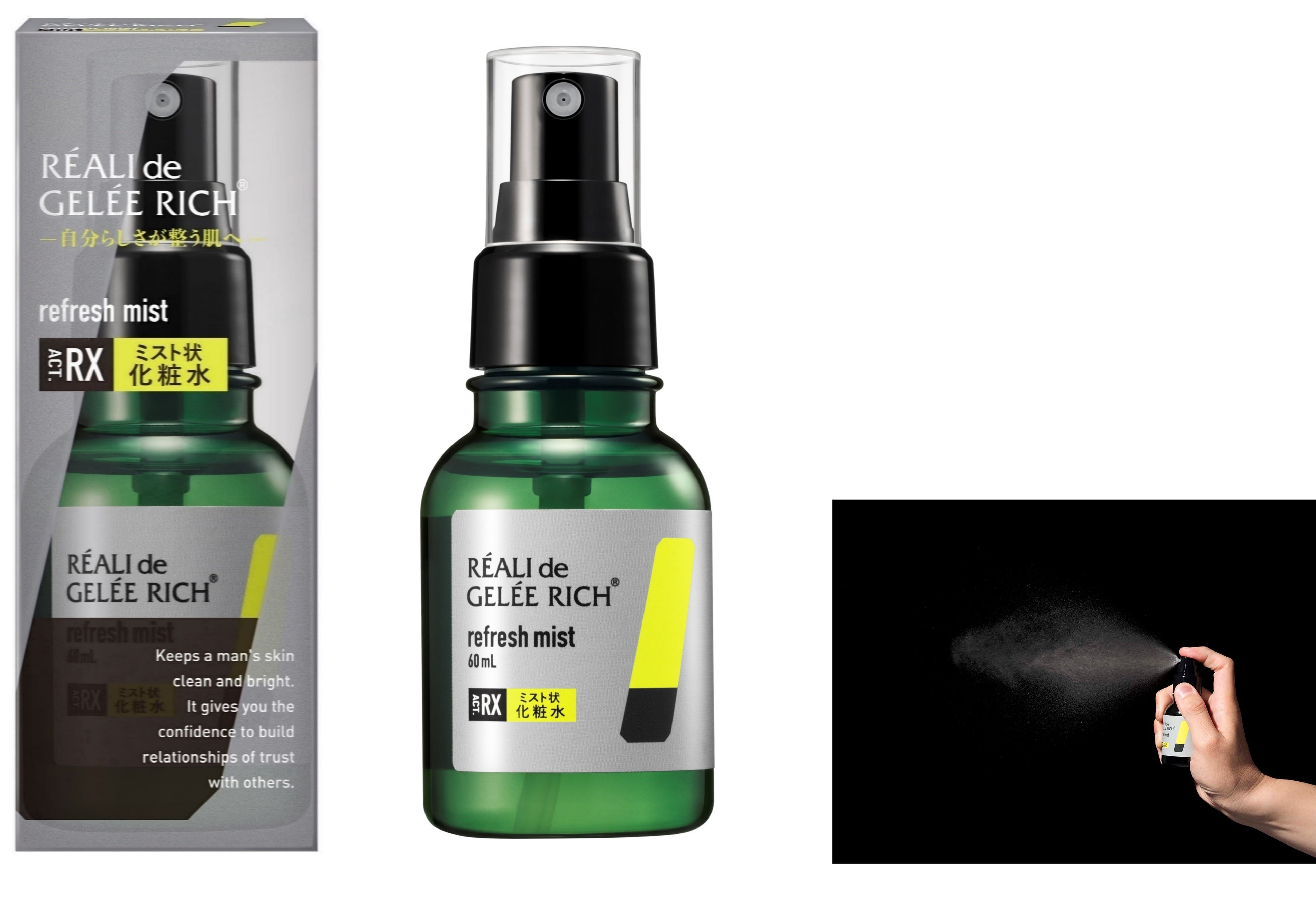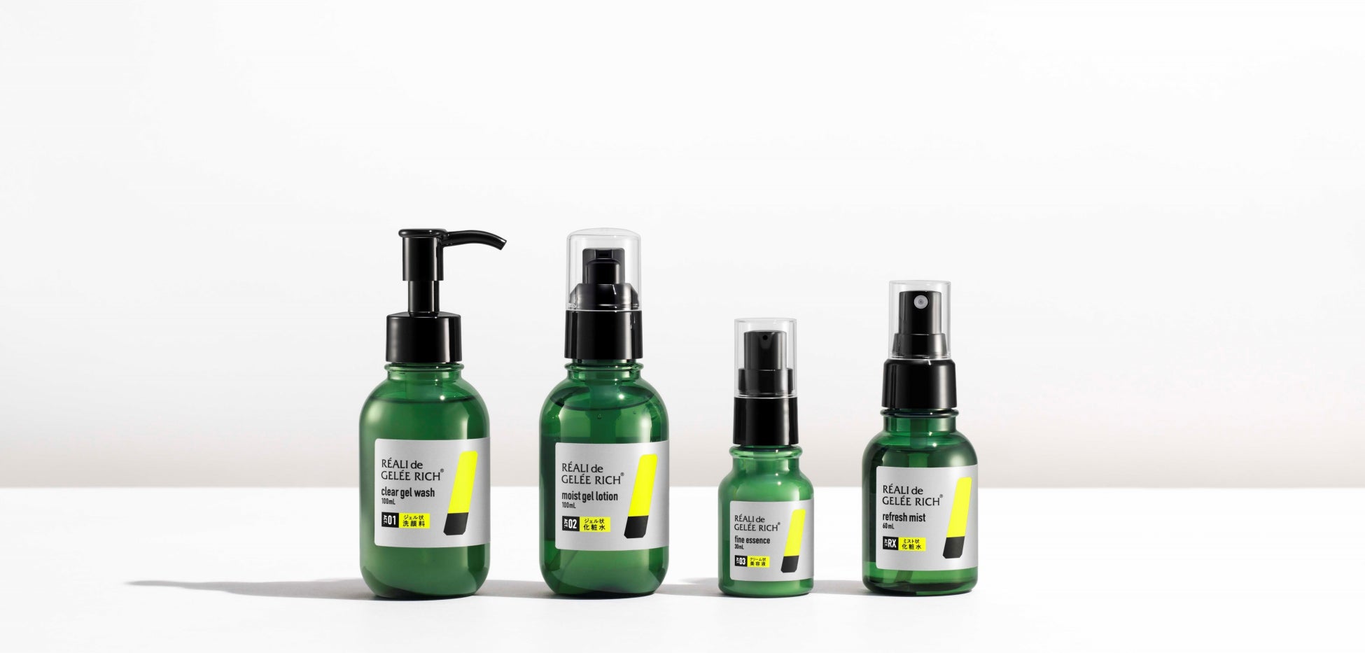 レアリは男性が求める機能にこだわり、基本的なスキンケアステップに応じた、ジェル状洗顔料、ジェル状化粧水、クリーム状美容液と、いつでも使えるミスト状化粧水の4アイテムを揃えました。