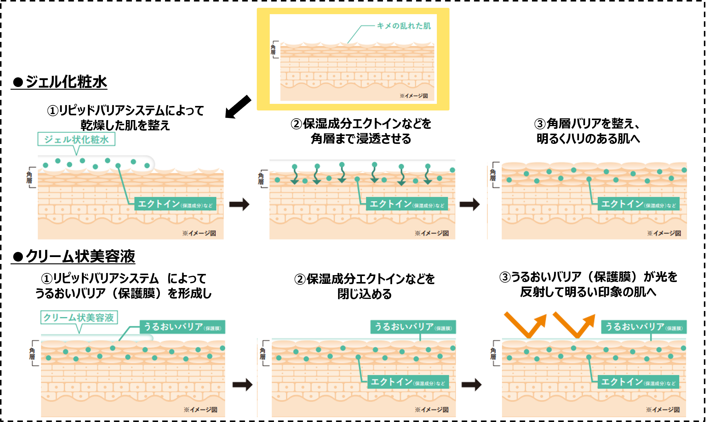 リピッドバリアシステムはジェル状化粧水「モイストジェルローション」とクリーム状美容液「ファインエッセンス」に採用。主に3種の構成成分*³がミセル状になって水性成分、油性成分を肌に届けることで、角層バリアを整えます。2品を重ねて使用することで、さらに保護膜が形成され、角層バリアが整い、より乾燥・肌荒れに対する予防効果が期待できます。