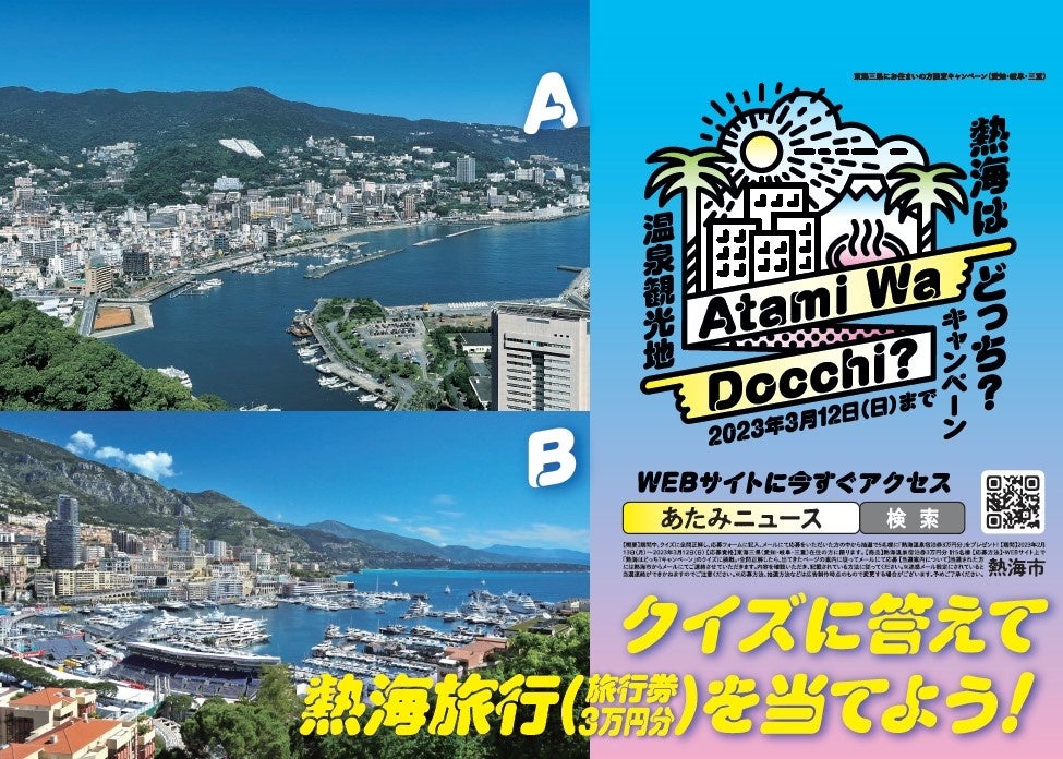 本市では、観光誘客を目的として、令和5年2月13日(月)から~東海三県にお住まいの方限定(愛知・岐阜・三重)~熱海はどっち?キャンペーン クイズに答えて熱海旅行を当てよう!を行ってます。