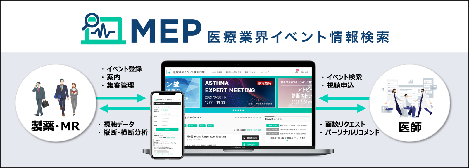 「MEP 医療業界イベント情報検索(メップ)」は、オンライン・オフラインを問わず講演会や研究会などの医療系イベントの開催情報を一つに集約した、製薬企業と医師をつなぐイベント情報プラットフォームです。登録医師に対して幅広く、細やかに案内できるため、全国講演会からエリア講演会までこれ一つで完結します。