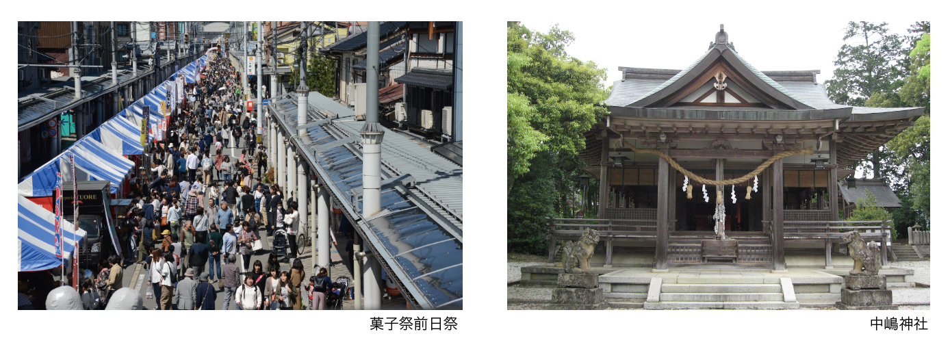 *中嶋神社:菓祖総本社。7世紀前半、飛鳥時代・推古天皇の時代の創建とされ、分社は福岡県の太宰府天満宮内をはじめ全国に7社。 神社の名前は「田道間守」のお墓が垂仁天皇稜(奈良県)の濠の中に、島のように浮かんでいることに由来すると言われて いる。現在の本殿は室町時代の建立され、明治45年に国宝に指定され、国の重要文化財になっている。