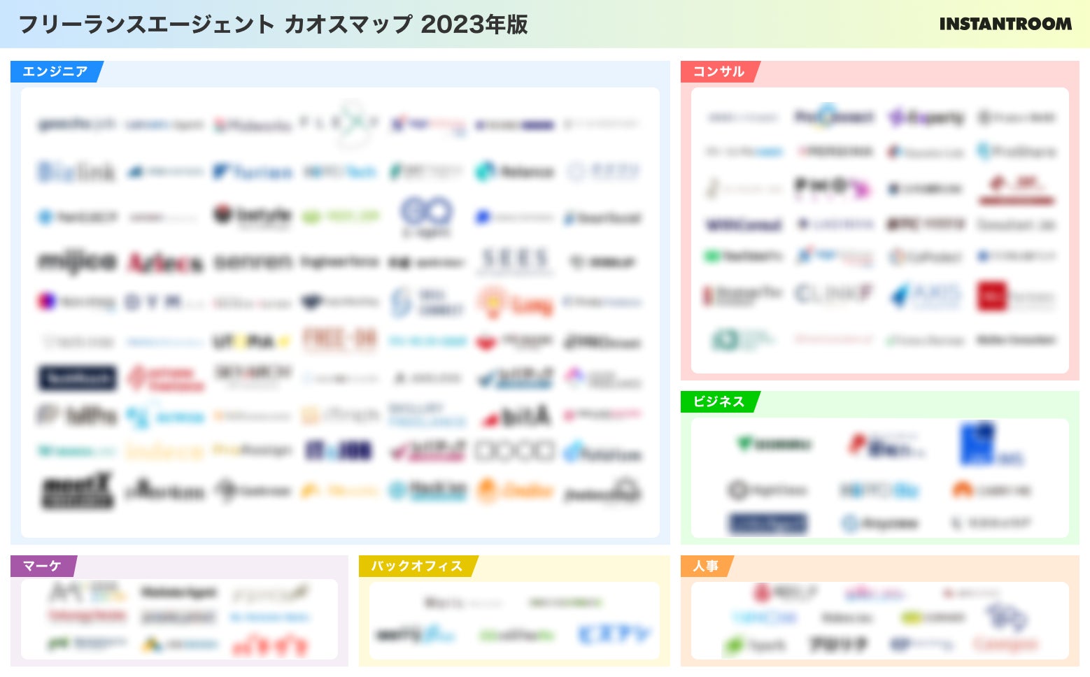 INSTANTROOM株式会社(本社:東京都渋⾕区、代表取締役:曽根弘介)は「フリーランスエージェント カオスマップ 2023年版」を公開しました。フリーランス事業に取り組んでいる134のサービスを6領域(エンジニア、コンサル、ビジネス、マーケ、バックオフィス、人事)に分類したカオスマップとなっています。