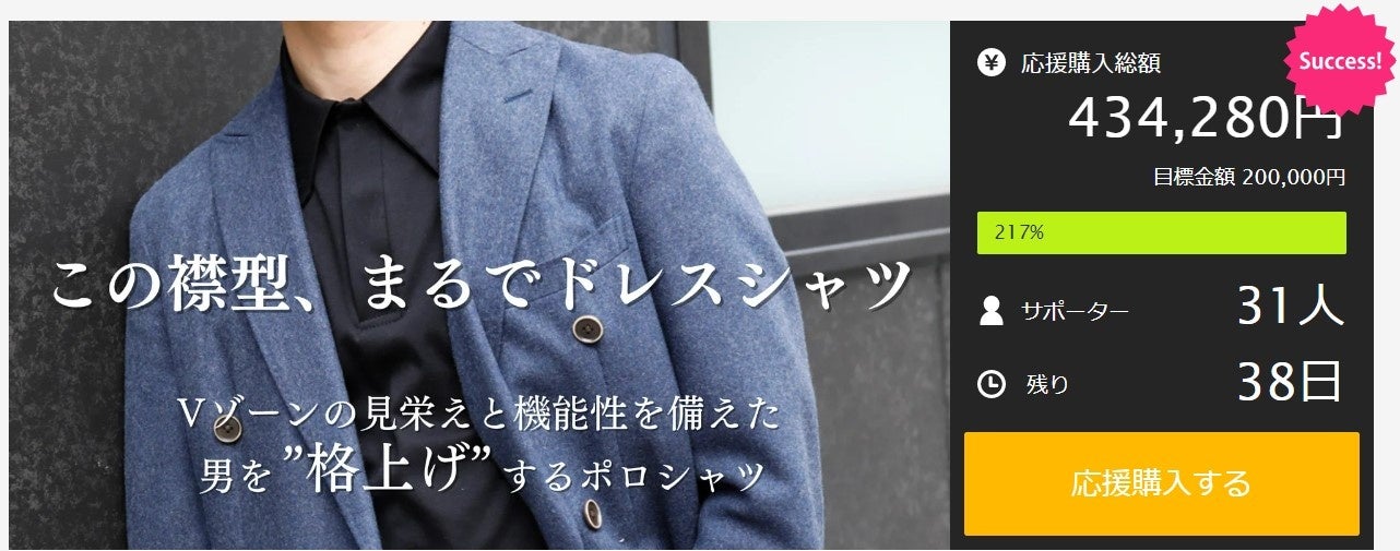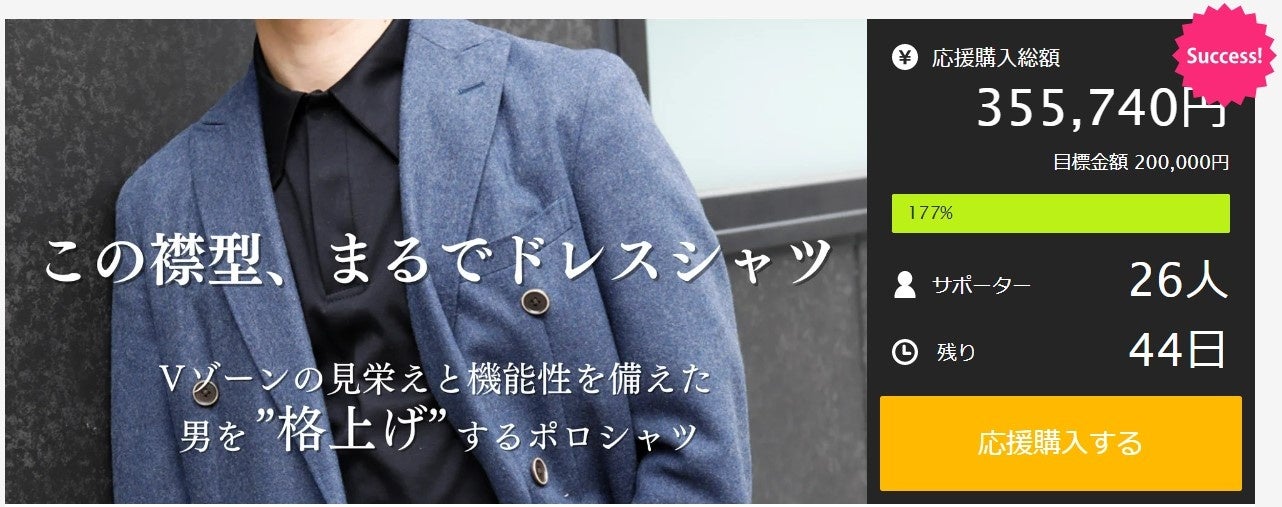 2月10日(金)よりMakuake(マクアケ)にて公開した「格別な品格を漂わせる。快適さはそのままに、襟型・生地にこだわった新・ポロシャツ」が目標金額の200%を達成しました!
