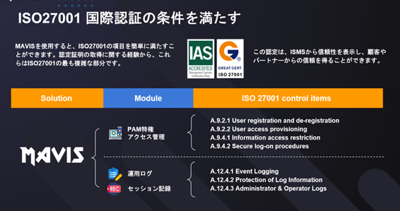 また、MAVISを使用するとISO27001の項目を簡単に満たすことができます。認定証明の取得に関する経験から、これらはISO27001の最も複雑な部分です。