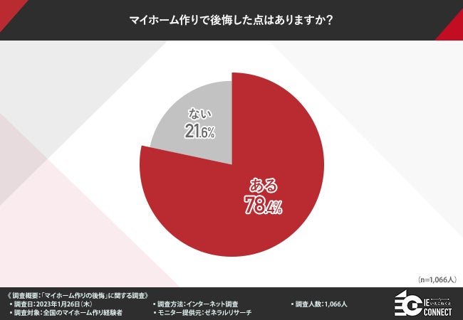 「マイホーム作りで後悔した点はありますか?」と質問したところ、8割近くの方が『ある(78.4%)』 と回答しました。