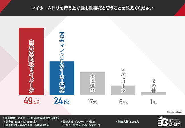 そこで、「マイホーム作りを行う上で最も重要だと思うことを教えてください」と質問したところ、『自身の間取りイメージ(49.4%)』 と回答した方が最も多く、次いで『営業マン(ハウスメーカー選び)(24.6%)』『土地選び(17.2%)』『住宅ローン(6.9%)』 と続きました。