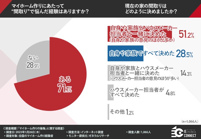 「マイホーム作りにあたって“間取り”で悩んだ経験はありますか?」と質問したところ、7割以上の方が『ある(71.1%)』 と回答しました。
