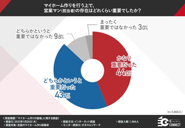 「マイホーム作りを行う上で、営業マン(担当者)の存在はどれくらい重要でしたか?」と質問したところ、『かなり重要だった(44.0%)』『どちらかというと重要だった(43.2%)』『どちらかというと重要ではなかった(9.8%)』『まったく重要ではなかった(3.1%)』 という回答結果になりました。