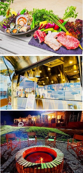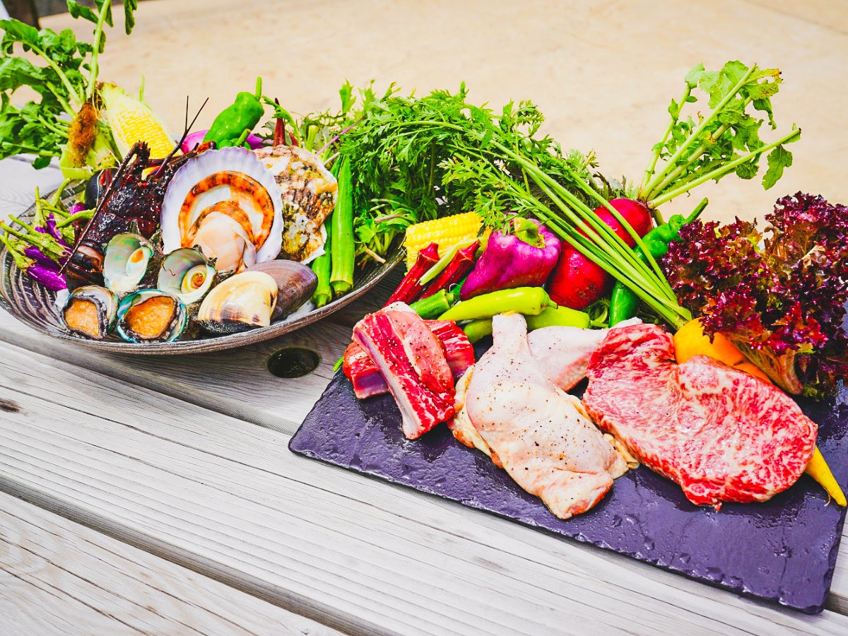 ワイン好きのためのコース仕立てのBBQ。メニューは、オードブルから始まり、修善寺椎茸と野菜のアヒージョ、メインには地物サザエの肝和え焼きや黒毛和牛サーロイン・フィレ肉のグリエ、桜エビの炊き込みご飯など。ウッドデッキに設置されたガスオーブングリルにてご自身のペースで仕上げていただきます。