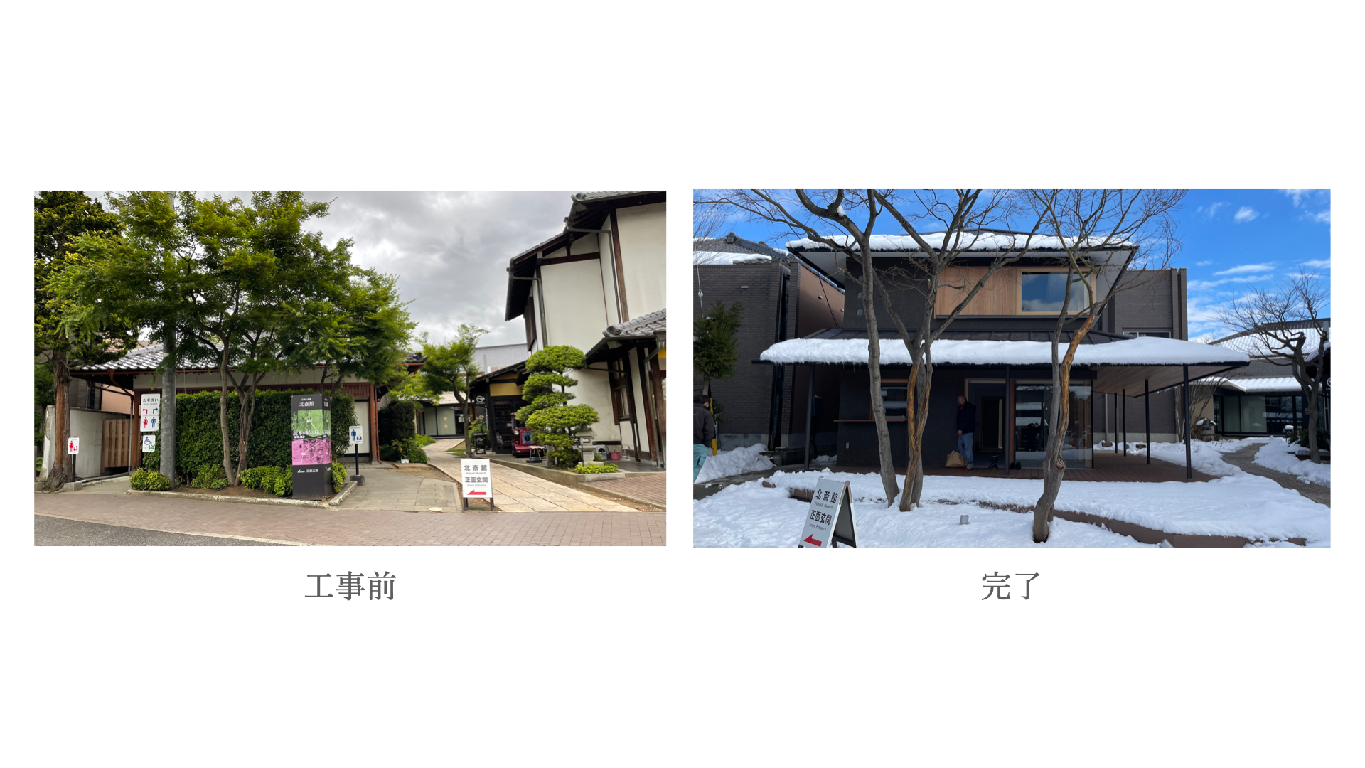 検討の結果、老朽化が進んでいた北斎館の屋外トイレを解体して、新設店舗を建造することになりました。資金面では、経産省の事業再構築補助金が採択されたことも計画をすすめる上で大きな助けになりました。2022年3月より既存建物の解体工事が始まり、2022年12月に建物が完成。2023年4月1日にグランドオープンの運びになりました。
