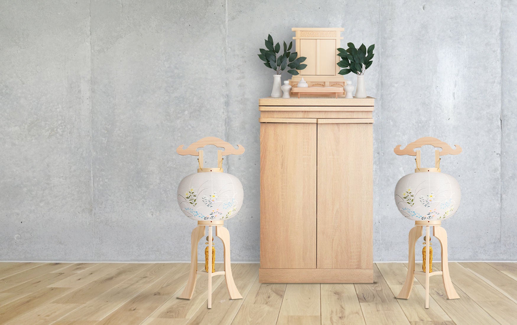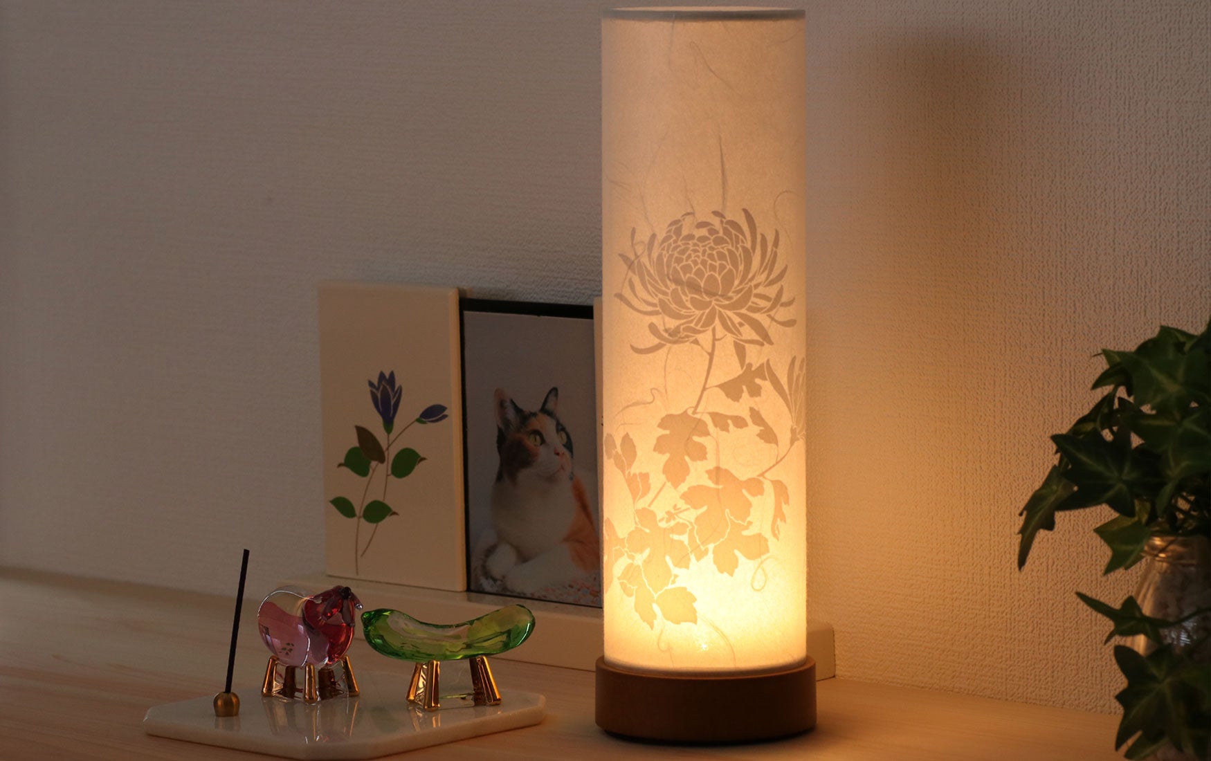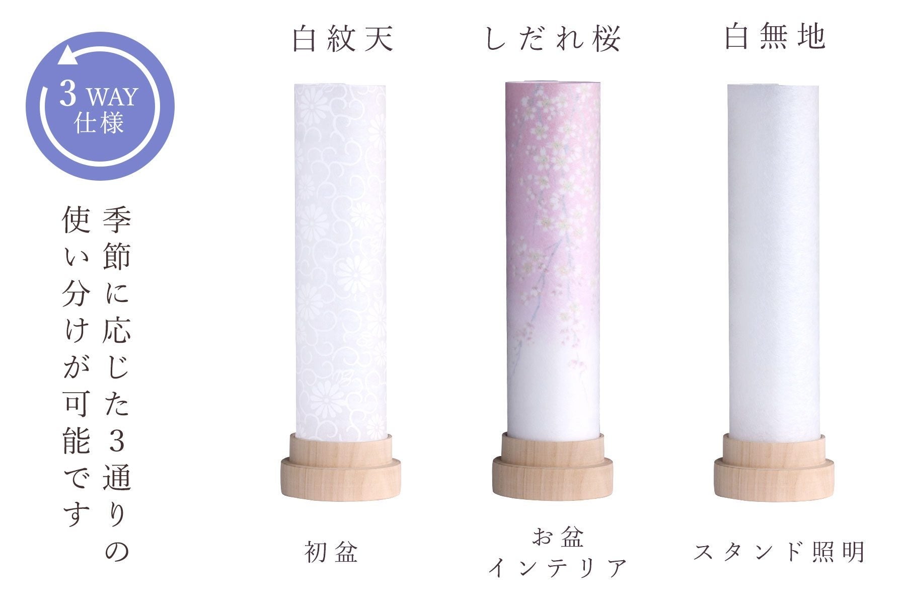 初盆の年は白色の「白紋天」柄を、2年目以降は絵柄シートを使い、神棚や盆飾りの周りを美しく照らします。絵柄シートを外せば「白無地」の和紙調、普段使いのインテリア照明として灯すことができます。