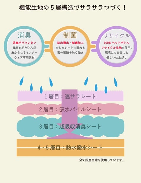 特徴1 鉄壁の5層構造+日本製機能素材で、サラサラをキープ