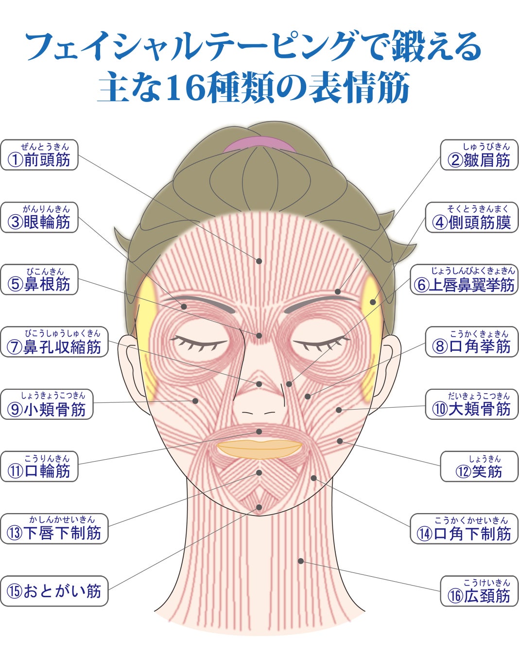 皮膚と表情筋は繋がっています。皮膚を引っ張ると表情筋も一緒に引っ張られます。表情筋や皮膚を正しい方向とテンションで引っ張り、固定し、睡眠することで効果が上がります。動画などのオンラインマニュアルを見て正しくテーピングし、根気よく継続する必要があります。