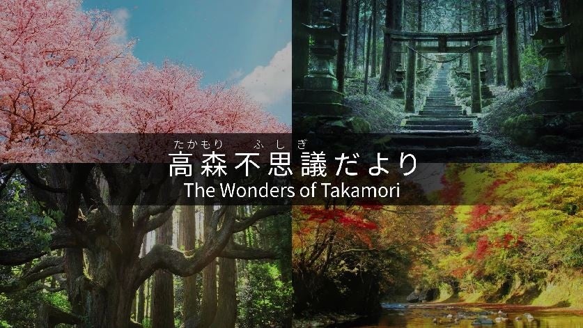 プレイングウォールシアター『高森不思議だより』は、高森町の観光資源である「上色見熊野座神社」「桜」「高森殿の杉」「川上渓谷」を背景に、高森町に関連する生き物、自然、食、物がトリック(だまし絵)要素として織り込まれた映像コンテンツです。