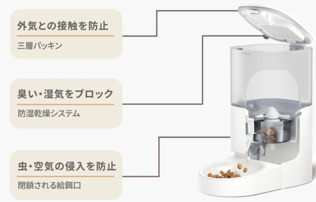 Homerunpetスマートペットフィーダーは3層の密閉構造で湿度や劣化を徹底的にブロック。愛犬・愛猫はいつでも鮮度の高いフードをお楽しみいただけます。