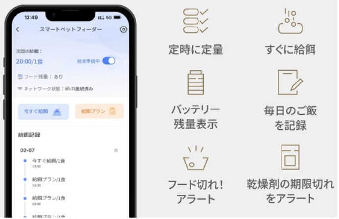 Homerunpet専用アプリと連動すれば、簡単にペットフードの時間・食事量・回数の設定ができます。また、データを自動記録してくれるため、ペットの日々の健康管理への活用も期待されています。