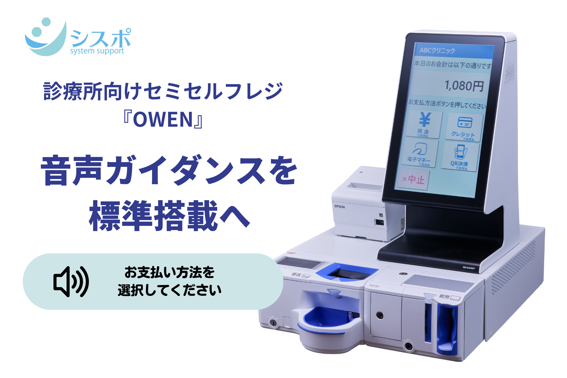株式会社三栄シスポ(京都府京都市、取締役:山中裕樹、梶谷正博、中井貴士、以下:当社)の提供する、診療所向けセミセルフレジ『OWEN』(https://sys-po.co.jp/owen_inq/)は、2023年4月以降の出荷分より音声ガイダンスを標準搭載することをお知らせします。
