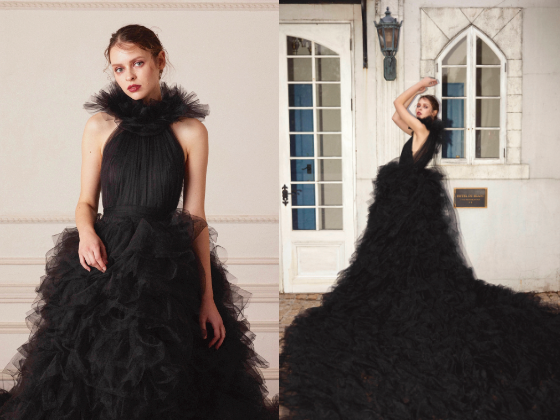 トレンドのブラックドレス。首元までチュールのハイネック。透け感があるチュール素材で重くなりすぎず、華やかな印象でパーティーシーンでも活躍。ボリュームがあるので主役の存在感はバッチリ。ウエストに背中で結ぶチュールリボンつき。